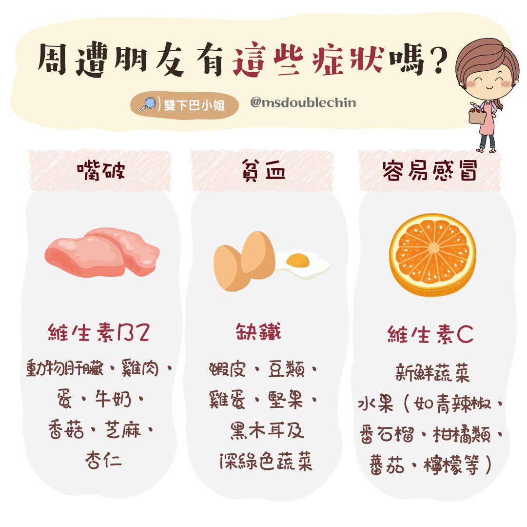 常常生活忙碌,營養可能就會不均衡,如果你朋友或家人的身體出現下列症狀時,需要提醒補充所需要的營養唷~