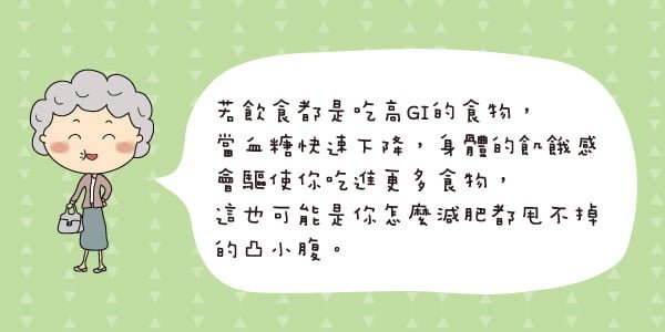 低GI飲食須注意: GI食物指的是消化吸收速度較緩慢的食物,並不代表低GI食物的熱量比中、高GI還低。瘦身的朋友還是需要搭配低脂或低醣飲食,來注意飲食的總熱量喔 。