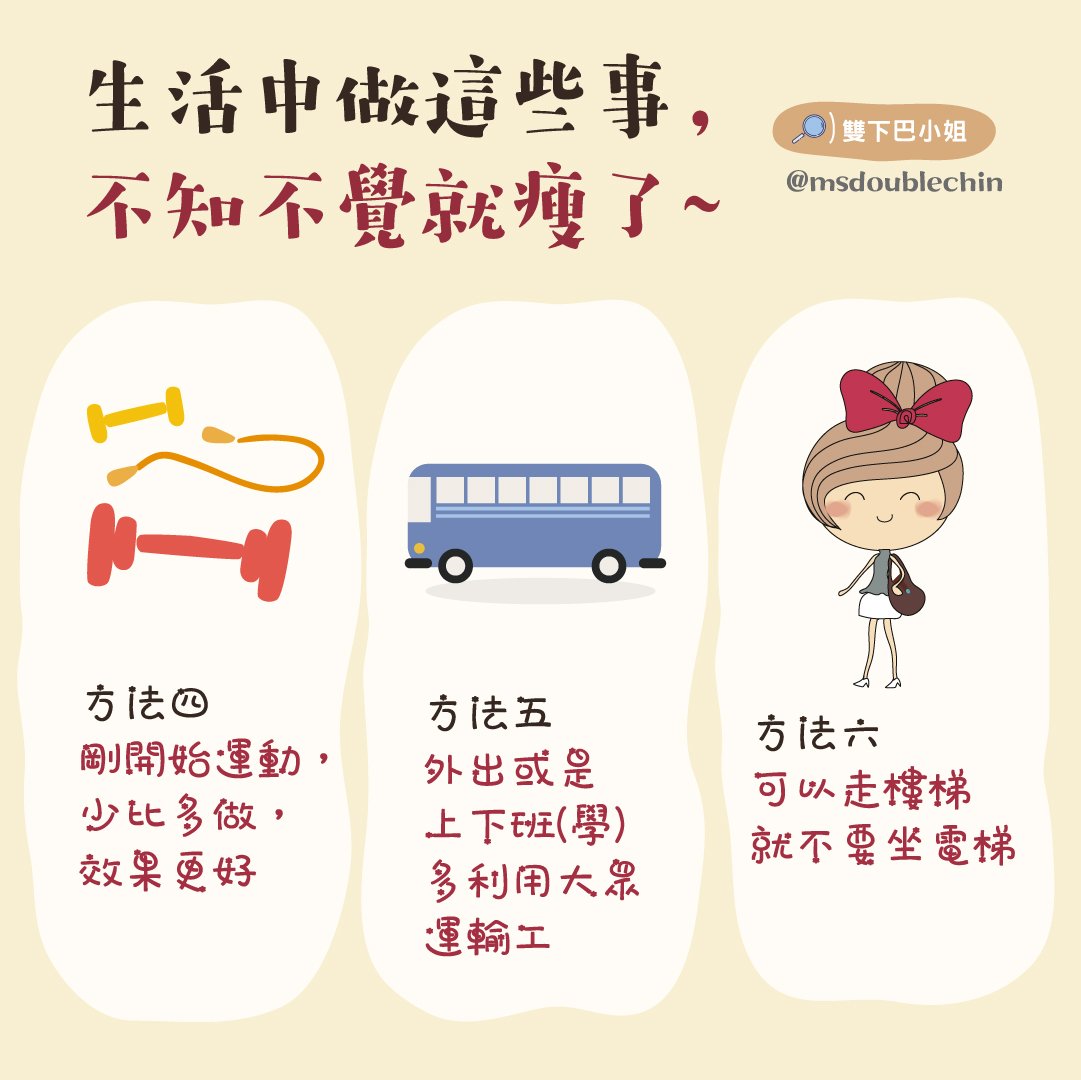 5.外出或是上下班(學)多利用大眾運輸工具,提早出門提前一站下車,步行至目的地。走路30分鐘可以消耗約100大卡的熱量.