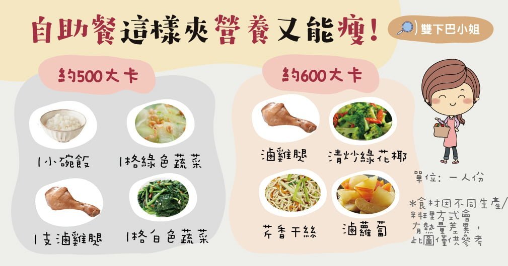 除了上述建議外,減重領袖李一休也曾在《ETtoday健康雲》撰文分享,由於自助餐的菜色偏油,建議選擇滷蛋或蒸蛋、白斬雞、滷雞腿,淋蒜蓉醬油的豬腱子肉、蒸魚、滷豆腐等低油料理。他提醒,「反光」愈明顯的通常都含有較多油脂,看起來油亮的宮保雞丁、糖醋排骨,在減肥期間,最好還是避開,而炸雞、炸排骨請直接跳過。