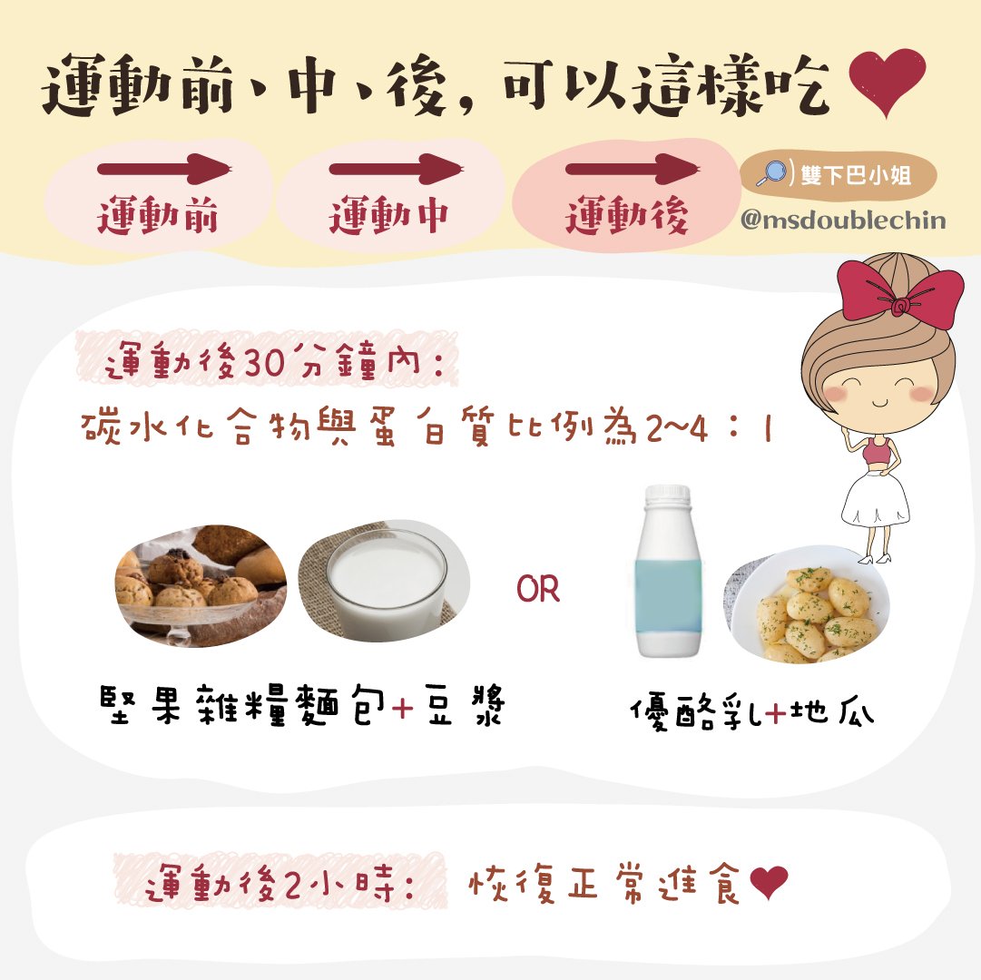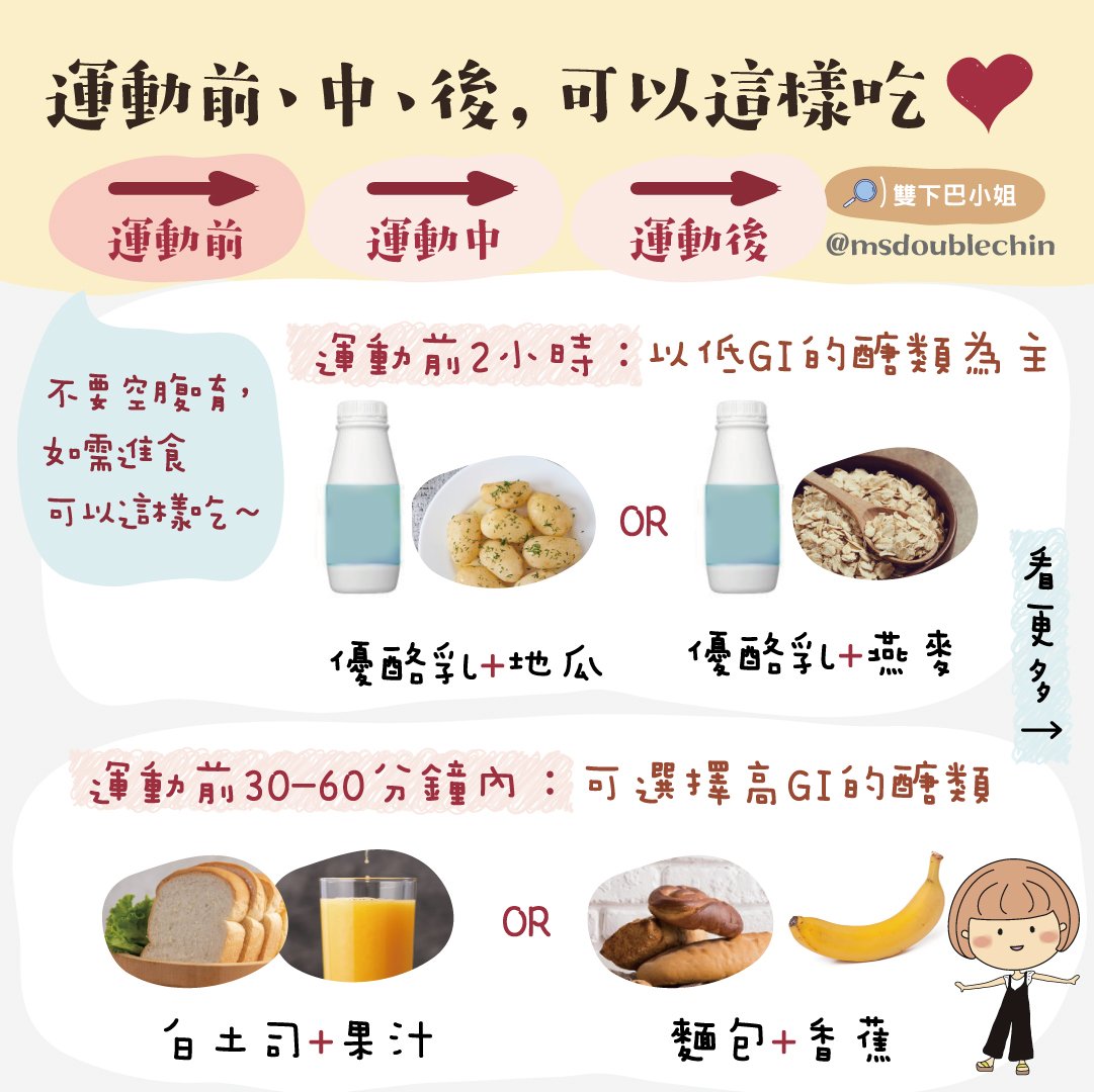 – 運動前60分鐘可選擇高GI的含醣食物。