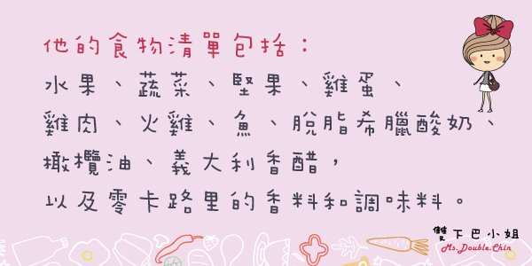 他的食物清單包括:水果、蔬菜、堅果、雞蛋、雞肉、火雞、魚、脫脂希臘酸奶、橄欖油、義大利香醋,以及零卡路里的香料和調味料。不在此清單中的東西,他都不吃。